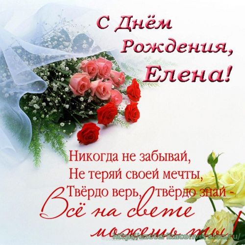 С днем рождения, Елена, Будь премудрой и прекрасной! Словно милая царевна, Ты сияй улыбкой ясной!