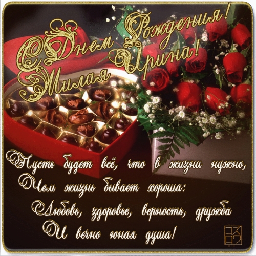 ДОРОГАЯ ИРИНУШКА ПОЗДРАВЛЯЮ С ДНЕМ РОЖДЕНИЯ! В это замечательный день от всего сердца хочу пожелать Вам исполнения всех желаний. Пусть сбудутся все мечты! Пусть успех, радость и вдохновения станут постоянными спутниками. Пусть голова кружиться только от переизбытка восторга, энергии и счастья. Желаю, чтобы Вас всегда окружали радостные и искренние улыбки Ваших родных. Еще, конечно хочется пожелать, чтобы Вы всегда оставались такой же неповторимой и очаровательной, и радовали нас новыми Волшебными энергиями. С ДНЕМ РОЖДЕНИЯ!
