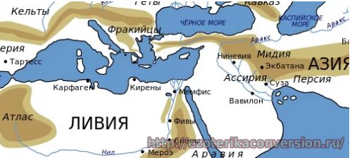 На этом-то острове, именовавшемся Атлантидой, возникло удивительное по величине и могуществу царство, чья власть простиралась на весь остров, на многие другие острова и на часть материка, а сверх того, по эту сторону пролива они овладели Ливией (северной Африкой) вплоть до Египта и Европой вплоть до Тиррении (западное побережье Италии). (Платон, «Тимей»).