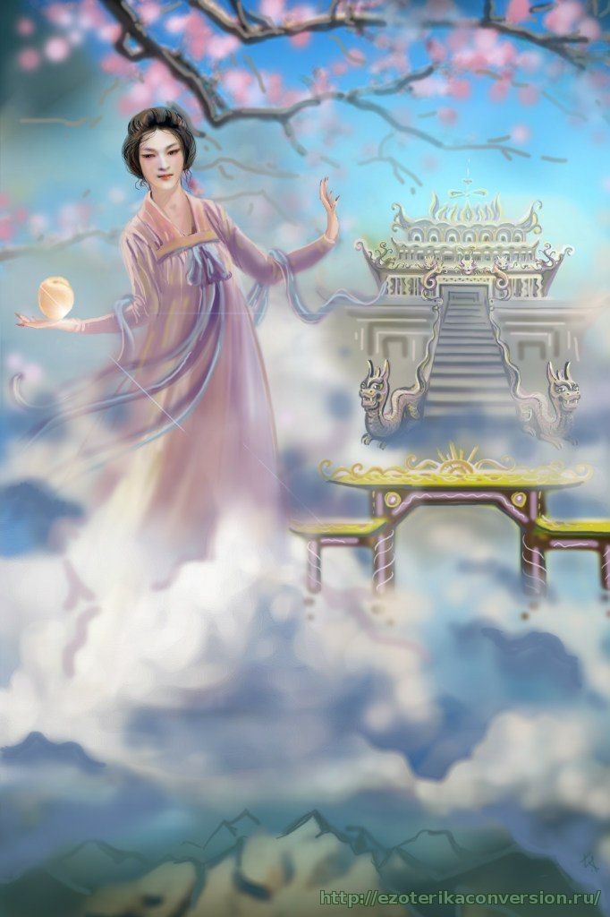 Немного информации из википедии: … СИ-ВАН-МУ́ (кит. владычица Запада), в китайской мифологии богиня — хозяйка Запада, хранительница тайны бессмертия. Живет на г. Куньлунь и владеет волшебными садами, где растут персики долголетия и бессмертия. Очень древний, архаический образ. Первоначально, считалась богиней страны мертвых, находящейся на западе, насылавшей смерть и болезни. Основным мотивом мифов о Си-ван-му становится добывание принадлежащего ей секрета эликсира бессмертия. В даосской мифологии Си-ван-му является воплощением женского начала инь, родившегося из эфира, у нее появляется супруг — повелитель Востока Дун-ВАН-гун, с которым она раз в год встречается на крыле огромной птицы. В средневековом китайском даосском фольклоре Си-ван-му представляется как хозяйка рая для бессмертных (сянь). Она и ее муж хранят их списки, повелевают ими, награждают за хорошие деяния и осуждают за плохие. На лубочных картинках ее изображают как красивую молодую женщину, часто с павлином, иногда рядом с супругом…