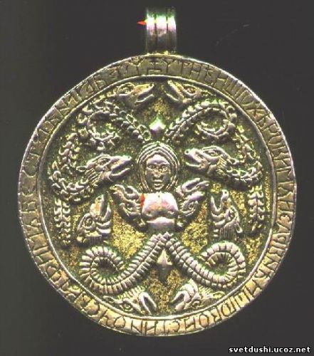 Две змеи по восточной символике входят в одно из обозначений знака Шамбалы и переводятся как «Преддверье». Солнце, внутри которого был треугольник с глазом. Это печать Шамбалы. Самые древние русские змеевики-обереги имели круглую форму. На одной стороне изображались семи- и двенадцатиголовые змеи или драконы, другие чудовища-охранители. А на другой стороне Солнце, внутри которого был треугольник с глазом. А потом, с приходом христианства, этот старинный символ, как языческий, заменили изображением Архангела. И вкупе со змеями получилось такое своеобразное сочетание элементов язычества и христианства.