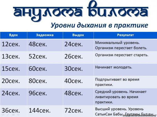Вот вам самый короткий путь: сначала вы будете задерживать дыхание каждый день на одну минуту, через месяц — на две минуты, затем больше и больше. Когда вы без усилий задержите свое дыхание на три минуты- организм будет недосягаем для болезней. На пять минут, то у вас автоматически начнется медитация. Потому что рассудочный ум остановится. Когда вы без усилий задержите дыхание на десять минут, то вы осознаете Реальность. Такое состояние человека называется Савикальпа-Самадхи, или иначе Вознесение. В этом бездыханном состоянии ученик приобретает колоссальные силы, истинное Знание и все сиддхи (сверхспособности). К этому моменту у него уже автоматически трансформируется физическое тело в Тело Света.