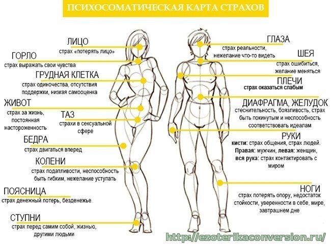 Плечи символизируют силу, а также ответственность. Поэтому здесь селится страх быть слабым, а также – не справиться с ответственностью.