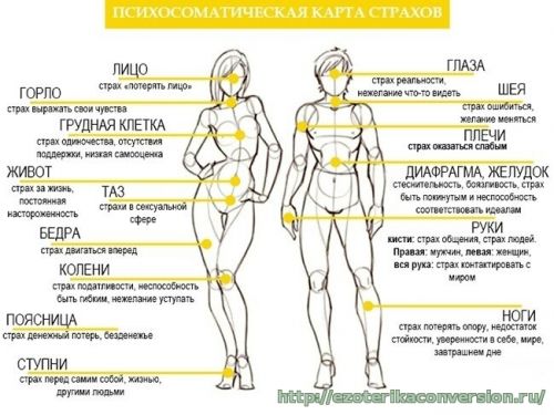 Один из основных законов телесно-ориентированной психотерапии гласит: «Тело помнит все». Воспоминания обо всем, что с нами произошло, хранятся в нашем теле, в том числе – о наших чувствах. Тело можно сравнить с чердаком, на который отправляется все то, что не хочется видеть в самом доме. И как хозяйка кричит: «Я не хочу видеть здесь эту рухлядь, отнесите ее на чердак!» — так и в нашем теле поселяются все те чувства, которые наше Сознание не хочет в себе видеть, то есть признавать. В психологии этот механизм называется вытеснением: в Бессознательное вытесняются болезненные переживания, мысли, воспоминания… В том числе, конечно, и страхи.