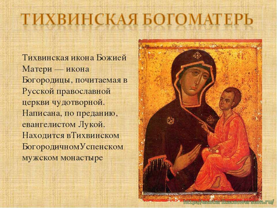 В доме следует расположить иконы Божьей Матери «Тихвинская» или «Знамение». Первая защитит их от вражеских сил, поможет при бесплодии, отведет беды. Вторая – позволит обрести мир и покой, исцелиться от страшных недугов, спастись во время пожаров и стихийных бедствий, избавиться от неприятелей и завистливых людей. Чистая и неустанная молитва перед обеими этими иконами позволит каждому верующему человеку успокоиться и примириться с недостатками этого мира.