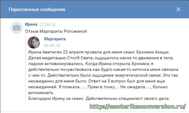 Благодарю Наталью Королеву за сеанс чтения Хроник Акаши. Я получила ответы на все мои вопросы. Они соответствуют моей жизни. Конечно, их надо еще осознать. Это очень долгожданный(несколько лет) и интересный опыт. Благодарю Наталью, ВСС, Ирину, Эзотерику Преображения за такую возможность.