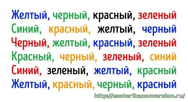 Слова на рисунке написаны разными цветами. Глядя на слово, проговаривайте вслух название цвета, которым оно написано. Завершив упражнение, выполните его в обратном направлении.