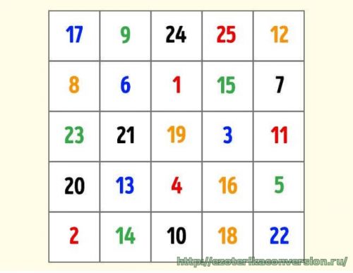 Останавливайтесь взглядом по очереди на каждой из следующих цифр. Задачу можно сделать труднее, разместив числами в ячейках таблицы иным образом.