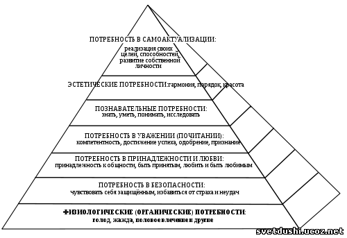 Наши желания и потребности Очень часто человек путает истинные потребности и желания, которые ему навязало общество. Специалисты по рекламе уже давно научились играть на чувствах людей и формировать у них ложные потребности. В большинстве случаев они материальные. Как же разобраться во всех этих сложностях с желаниями и потребностями? И для чего это нужно? А нужно это для того, чтобы не удивляться, что желания не сбываются, а потребности не удовлетворяются. К сожалению, люди чаще всего сами не знают чего хотят на самом деле. Вернее, в голове мы хотим одного, а подсознательно - другого. А Вселенная (Бог, Жизнь, Космические силы) исполняет именно то, чего мы хотим подсознательно. Например, вы абсолютно уверены, что хотите стать очень богатым. Но в душе у вас затаился страх, что это опасно, что придется зарабатывать нечестным путем, или что богатых не любят, и так далее. И в итоге ваше истинное желание звучит так: «Я не хочу быть богатым. Это опасно!». Вселенная слышит это и делает так, что все ваши попытки стать богатым проваливаются, а вы удивляетесь, почему такое искреннее желание не сбывается. Или девушка очень хочет выйти замуж. Но в душе у нее затаился страх того, что любимый ей будет изменять. Все мужчины же изменяют. Да и папа ушел из семьи по этой причине. Или что-то еще. И этот скрытый страх и есть посыл к Вселенной: «Я не хочу замуж!!! Я боюсь!». Потребность - это нужда человека в том, что составляет необходимое условие его существования. И сначала появляется потребность, а уж потом желание. Рассмотрим иерархию потребностей по Маслоу: