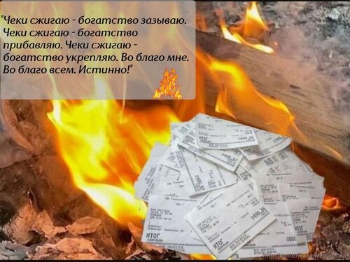"Чеки сжигаю - на деньги меняю, Чеки сжигаю - деньги зазываю, Чеки сжигаю - доход прибавляю, Чеки сжигаю - богатство умножаю. Да будет так!"