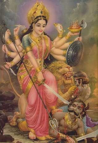 Кали - это страшная и жестокая форма Богини-Матери. Она приняла форму могущественной Богини и стала популярна с написанием Деви Махатмы, текста 5-6 в.н.э. Здесь она изображена, как родившаяся из лба богини Дурги во время одной из ее битв со злыми силами. Как гласит легенда, в битве Кали была настолько вовлечена в убийство, что, забывшись, начала уничтожать все вокруг.