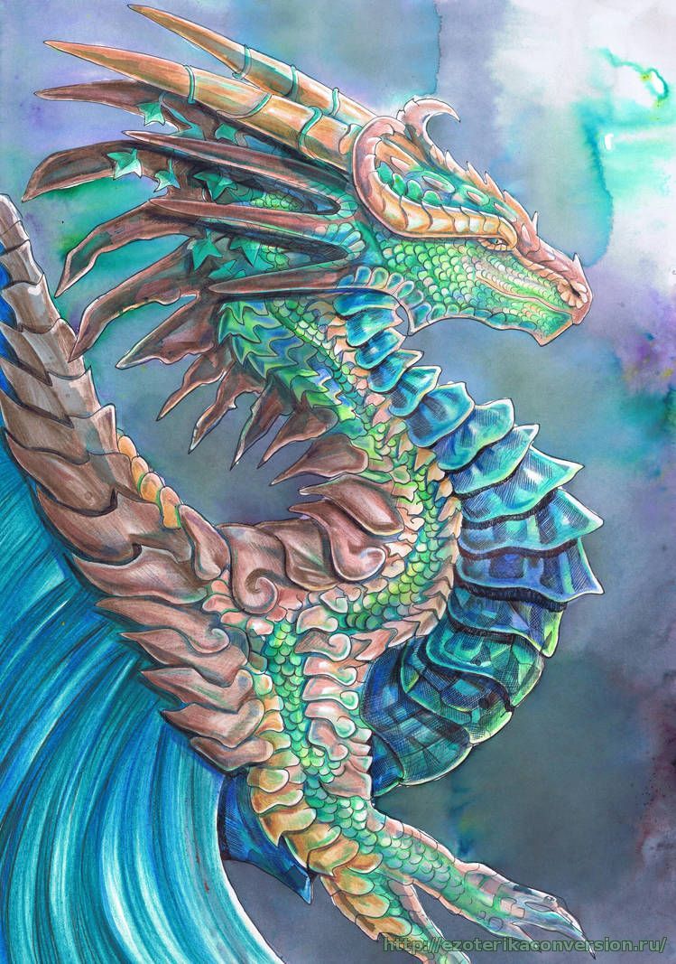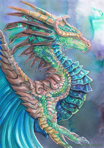 Четвертый дракон -СИНИЙ ДРАКОН. Ее стихия - вода. Он живет в морях и ручьях мира. Работая с этим драконом, он помогает очищать воду и исцелять тех, кто, возможно, отравился от питья и употребления плохой воды.
