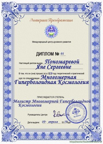 ЭТАПЫ ОБУЧЕНИЯ Чтобы пройти посвящение в космические каналы Многомерной Гиперболоидной Космологии не нужен многолетний опыт и практика в десятки лет. Все что может понадобиться, ученику дает Магистр в процессе обучения. Приобретенные возможности останутся у ученика после инициации навсегда! Практиковать посвященный сможет начать, когда ему только будет удобно и желательно. Начальный уровень — обучение и посвящение в канала на выбор из списка, один из каналов обязательно базовый - универсальный. Продвинутый уровень - поэтапные посвящения в любые каналы Гиперболоидной космологии на выбор. Уровень Мастер - это обладание 56 каналами. Мастером Многомерной Гиперболоидной Космологии не активируются каналы по одному, у Мастера есть свой пароль мастера, который активизирует все каналы одновременно, и необходимые вступают в действие, а другие каналы ожидают своей очереди, и будут включатся при необходимости. Необходимый на данный момент канал самостоятельно включается в работу, в свое время. Мастер Гиперболоидной Космологии, чтобы исцелить и помочь в различных ситуациях просто дает определенные установки, которые подробно описаны в методике. Мастер имеет право посвящать клиентов в канал самоисцеления «АЛЬБОРАДО». Уровень Магистр - Посвящение в Магистра Многомерной Гиперболоидной Космологии открывает возможность работать практику со всеми 72 каналами, и открывать как на себя, так и на других, сверхмощный канал Магистра, тем самым добиваясь еще более высоких результатов. При открытие канала Магистра, самостоятельно активируются и приступают к работе, все необходимые каналы Гиперболоидной Космологии. Магистр имеет право посвящать во все каналы Гиперболоидной Космологии до уровня Магистра. По окончанию обучения выдается сертификат.