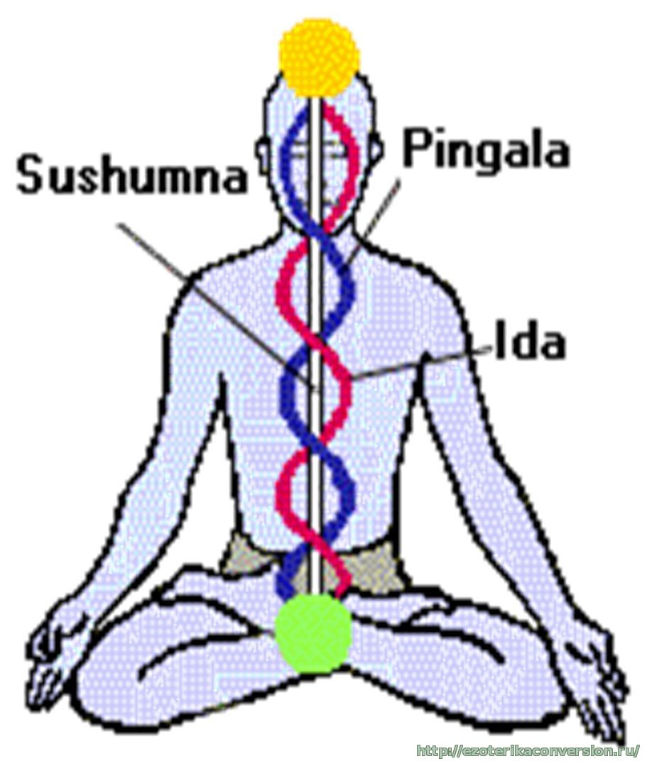 Каналы Существует три основных энергетических канала - левый канал (ида), правый канал (пингала) и центральный канал (сушумна). Они связывают между собой различные чакры нашего тонкого тела. Левый канал питает левую симпатическую нервную систему и несет энергию нашего желания. Из желаний возникают наши эмоции. Наши желания - основа действий, без их движущей силы мы бы ничего не делали. Левый канал отвечает за прошлое человека. Все, что является настоящим сегодня, становится прошлым завтра. Бессознательное черпает информацию и образы из этого канала. Кроме того, бессознательный ум каждого человека соединен с многовековым коллективным бессознательным умом. Все события, произошедшие с момента сотворения мира, пребывают в дремлющем состоянии в коллективном бессознательном. В этом коллективном бессознательном накапливается и хранится все, что происходило в процессе эволюции, все, что является мертвым или выпало из процесса эволюции, а также все, что выходит из бессознательного ума людей. Правый канал питает правую симпатическую нервную систему и несет энергию действия. Эта энергия включает в себя умственную и физическую деятельность. С правой стороны находится сознательный ум, который создает наше будущее. Все, что человек думает относительно будущего, записывается на правой стороне, которая имеет выход в коллективное надсознание. Коллективное надсознание получает все, что является мертвым, что случилось вследствие чрезмерно амбициозных, ориентированных на будущее личностей, агрессивных животных или растений.Центральный канал также называется Срединным путем. Он управляет активностью, которую мы не можем сознательно контролировать. Биение сердца, наполнение легких воздухом, перенос кислорода кровеносной системой, рождение мыслей - все эти сложные функции не под силу выполнить тысячам компьютеров. Это происходит вне зависимости от того, где наше внимание, нет необходимости в сознательном руководстве и контроле. Деятельность центрального канала протекает спонтанно, естественно, без усилий со стороны человека. Подъем Кундалини и ее работа, также как и другая духовная работа - спонтанны.