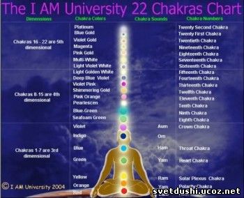 чакры 1-7 относятсяк третьему измерению; чакры 8-15 - к четвертому измерению; чакры 16-22 - к пятому измерению; чакры 23-30 - к шестому измерению; чакры 31-36 – к седьмому измерению;