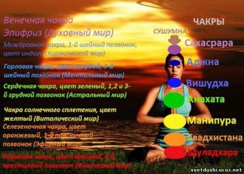 Чакры "мира цветов" - икры ног. Принятие энергии цветовой гаммы растительного мира Земли. Цветовая гамма - цвет, спектр и запах, которые передаются через воздух. Цветотерапия положительно влияет на человека. Негатив - болят вены, икры ног.