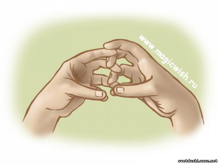 Техника выполнения мудры Поднимаем руки на уровень солнечного сплетения ладонями вверх, пальцами по направлению друг к другу. Чуть сгибаем пальцы, и переплетаем их между собой таким образом, чтобы кончики (ногтевые фаланги) одной руки расположились между кончиками пальцев другой руки (обратите внимание на рисунок ниже). Большой палец на каждой руке выпрямляем и соединяем его кончик с подушечкой мизинца (большой палец левой руки соединяем с мизинцем левой, большой палец правой - с мизинцем правой).