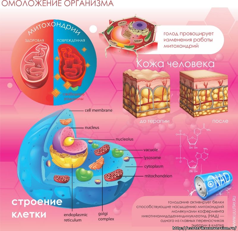 Человек, конечно, устроен гораздо сложнее планарии и полностью при голоде не обновляется, но все же омоложение весьма значительно и всегда заметно. И сами голодающие, и их знакомые не устают восхищаться случившемуся преображению. Доктор биологических наук, профессор Лев Владимирович Полежаев считает лечебное голодание естественным фактором, стимулирующим физиологическое восстановление, обновления всех клеток организма, их молекулярного и химического состава. В чем же причина этого явления? Объяснили процесс омоложения на клеточном уровне исследования американских биологов. Они показали, что голод провоцирует изменения работы митохондрий.Учёные из Гарварда, Корнелла и американского Национального института здоровья под руководством гарвардского доцента Дэвида Синклера отметили, что голодание приводит к активизации белка, который способствует насыщению митохондрий молекулами кофермента никотинамидадениндинуклеотид (НАД) — одного из главных переносчиков энергии в клетке. Именно обилие НАД, по мнению исследователей, позволяет в полной мере использовать кодируемые SIRT3 и SIRT4 «ферменты молодости» митохондрий — вместо естественного угасания деятельности органелл, неминуемо ведущего к смерти всей клетки, митохондрии не просто восстанавливают свою работоспособность, а начинают работать лучше, чем когда бы то ни было.Повышенная отдача, с которой митохондрии начинают производить энергию, позволяет существенно замедлить процесс старения клеток, практически отключая естественный механизм самоубийства старых клеток. Более того, активизация митохондрий способна на время компенсировать потерю всех остальных источников жизни в клетке. Даже если ядро её оказывается совсем неработоспособно, делая бессмысленным дальнейшее сохранение жизненной единицы, механизм клеточного самоубийства отказывается запускаться. Как именно митохондрии блокируют отмирание клеток, учёные пока не знают.