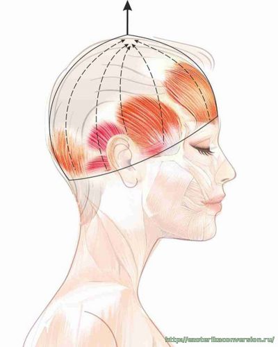Выполнение: мысленно потяните все мышцы свода черепа в направлении макушки. Почувствуйте, как смещается вверх лобное и затылочное брюшки надчерепной мышцы, как сокращается сухожильный шлем (апоневроз), как стремится вверх височная мышца, тянутся вверх и назад ушные мышцы, напрягается и тянется к макушке затылочное брюшко, увлекая за собой мышцы задней поверхности шеи.