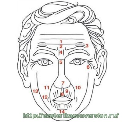 Морщины на лице появляются независимо от состояния кожи в строго определенных местах. Происходит это в случае ослабления или заболевания связанных с этими местами внутренних органов, а также из-за «сбоев» в других телах: энергетическом, мысли и сознания. На рисунке изображены наиболее часто встречающиеся морщины.