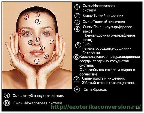 Опытный врач сможет многое определить, как по цвету лица и его влажности, так и по глубине морщин и их расположению, а так же по сосудистому рисунку. Если во внутренних органах появляются нарушения, то на коже лица, в местах которые соответствуют тем или иным органам, не редко появляется сыпь.