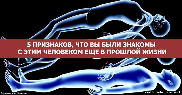 В жизни иногда так случается, что мы находим людей, с которыми не были раньше знакомы, но при этом ощущаем с ними очень сильную связь, будто нашли давно потерянного друга. Подобная связь возникает только с теми, с кем вы были знакомы в прошлой жизни, чем и объясняется то, что вы так легко находите общий язык. В жизни бывает много странных совпадений, и кто может наверняка сказать, что вам не доводилось переживать эти совпадения раньше? Важно понять, что вы встретили человека с близкой вам энергетикой. Поддерживать дальнейшее общение с таким человеком просто необходимо — вы будете поражены, насколько у вас много общего! Вот пять признаков того, что вы уже встречали человека в прошлой жизни. 1. С ним вы теряете счёт времени Один из самых очевидных признаков того, что вы уже были знакомы с человеком в другой жизни, — это то, что вы теряете всякий счёт времени и рядом с ним дни бегут с невероятной скоростью. Вы с ним провели уже столько времени, что кажется, будто вы уже миллион раз встречались. Каждый разговор, каждое совместное занятие лишь порождает у вас обоих желание вместе сбежать от всего мира. Вам легко с ним быть и ещё легче откровенничать. 2. Вы знаете его «как свои пять пальцев», и так было с самого начала Ещё один заметный признак того, что вы были знакомы в другой жизни, — вы видите человека насквозь. Вы обращаете внимание на едва заметные движения и жесты, которых он сам не замечает. Вам всегда очевидно, когда этот человек не в себе или просто в плохом настроении. Иногда вам кажется, что он способен читать ваши мысли, а иногда вы в точности знаете, что ему сейчас нужно.
